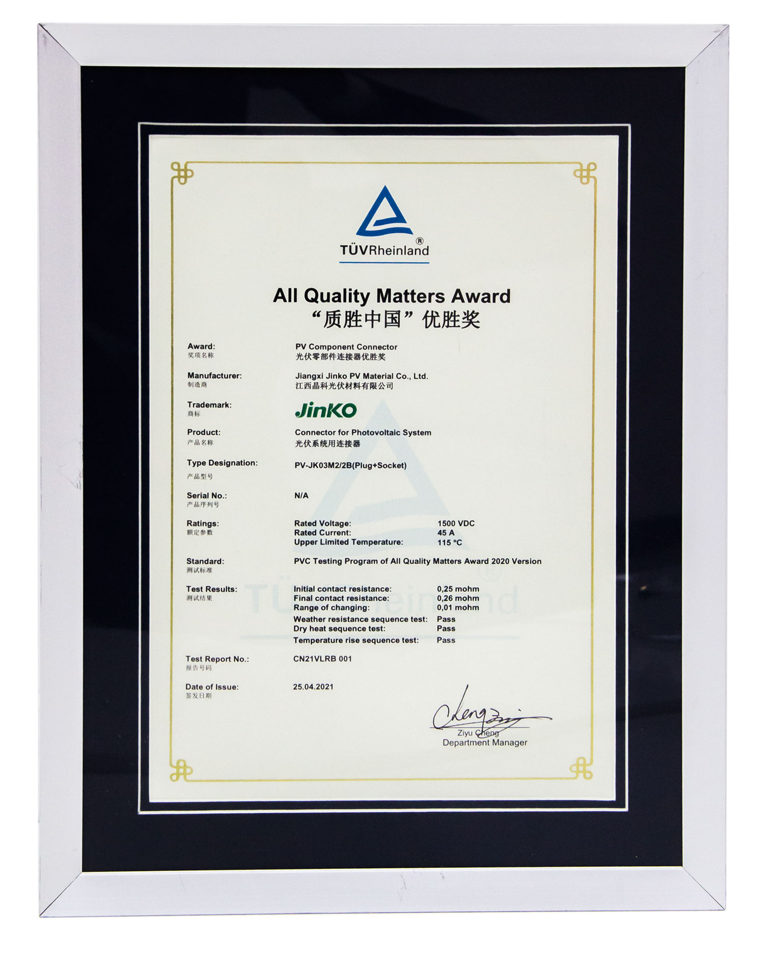 4月28日,TüV萊茵第七屆“質(zhì)勝中國”光伏盛典暨“質(zhì)勝中國優(yōu)勝獎(jiǎng)”頒獎(jiǎng)典禮在杭州西溪喜來登度假大酒店隆重舉行。晶科光伏憑借JK-03M2連接器在大電流環(huán)境穩(wěn)定可靠的運(yùn)行能力,在眾多競爭者中脫穎而出,繼2019年后再次斬獲“光伏零部件連接器優(yōu)勝獎(jiǎng)“